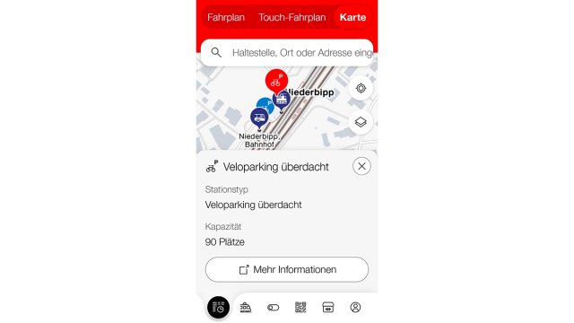Neu sind pro Standort die Veloständer an unseren Bahnhaltestellen in der ÖV-Karte der SBB ersichtlich. Die Informationen über die Ausrüstung der Bahnhöfe sind auf der Website der SBB oder in der App SBB Mobile abrufbar.